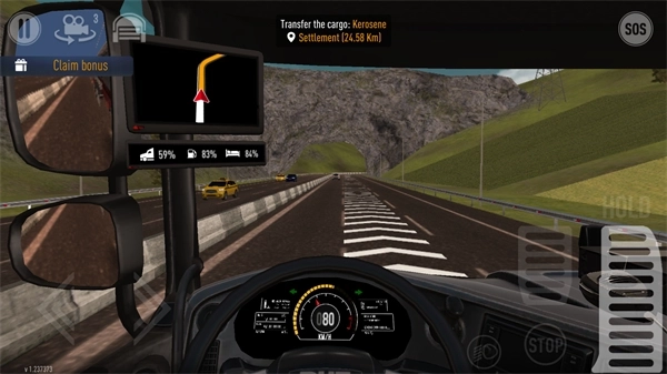 6、游戏界面下方的黄色进度条依次对应车辆的耐久度、剩余油量以及你的疲劳值。一旦这三个数值的显示变为红色,你就得前往最近的休息站,通过车辆维修、补充燃油和购买咖啡的方式,来提升这些偏低的数值。