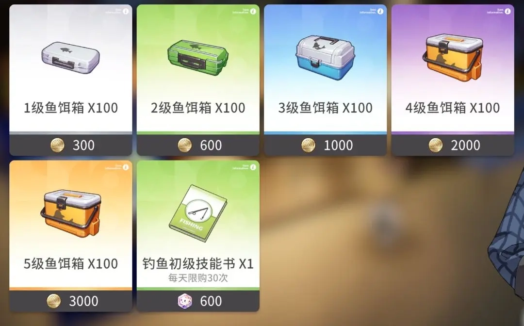 首先要说明的是,鱼饵箱和钓鱼等级是相互绑定的,每提升两级钓鱼等级才能解锁下一级别的鱼饵箱,所以大家购买时一定要注意别选错了!刚开始的时候,大家只能购买白色的鱼饵箱来钓鱼!