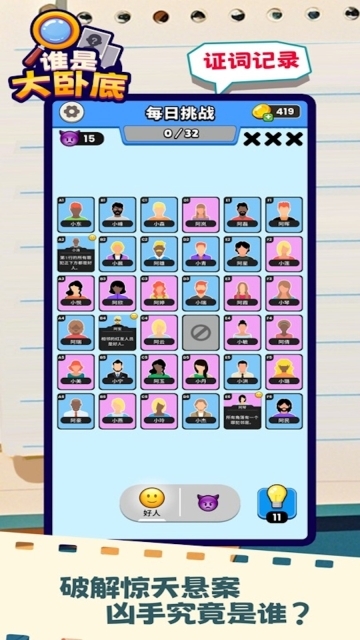 《找出谁是凶手》是一款以侦探为主题的逻辑推理解谜休闲游戏。游戏里,玩家将化身为侦探,深入一个个错综复杂的案件现场。通过收集线索、分析证据、逻辑推理,一步步揭开背后隐藏的真相,揪出潜藏在人群中的卧底或凶手,守护无辜者不被伤害。