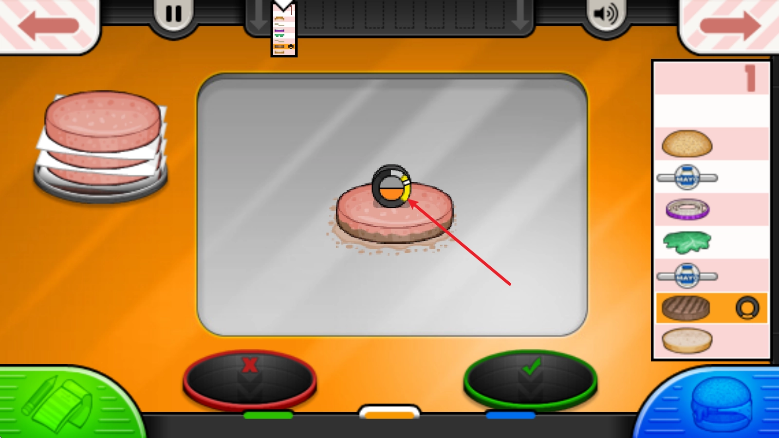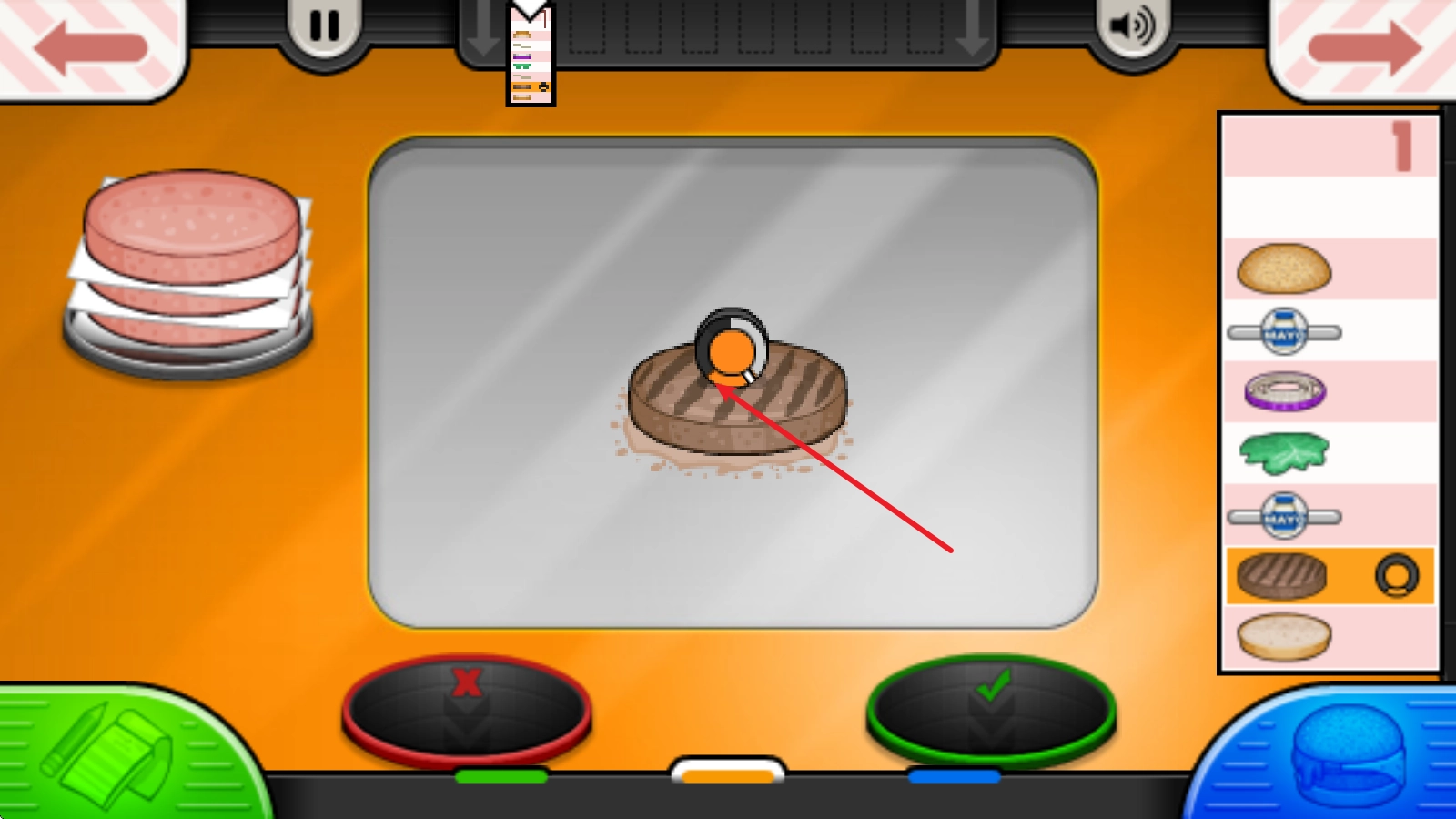 记录下客人的需求后,我们就可以着手制作了。第一步是炸肉饼,这一步的关键在于把握翻面的时机,得等这里的时间显示变成橙色才行。