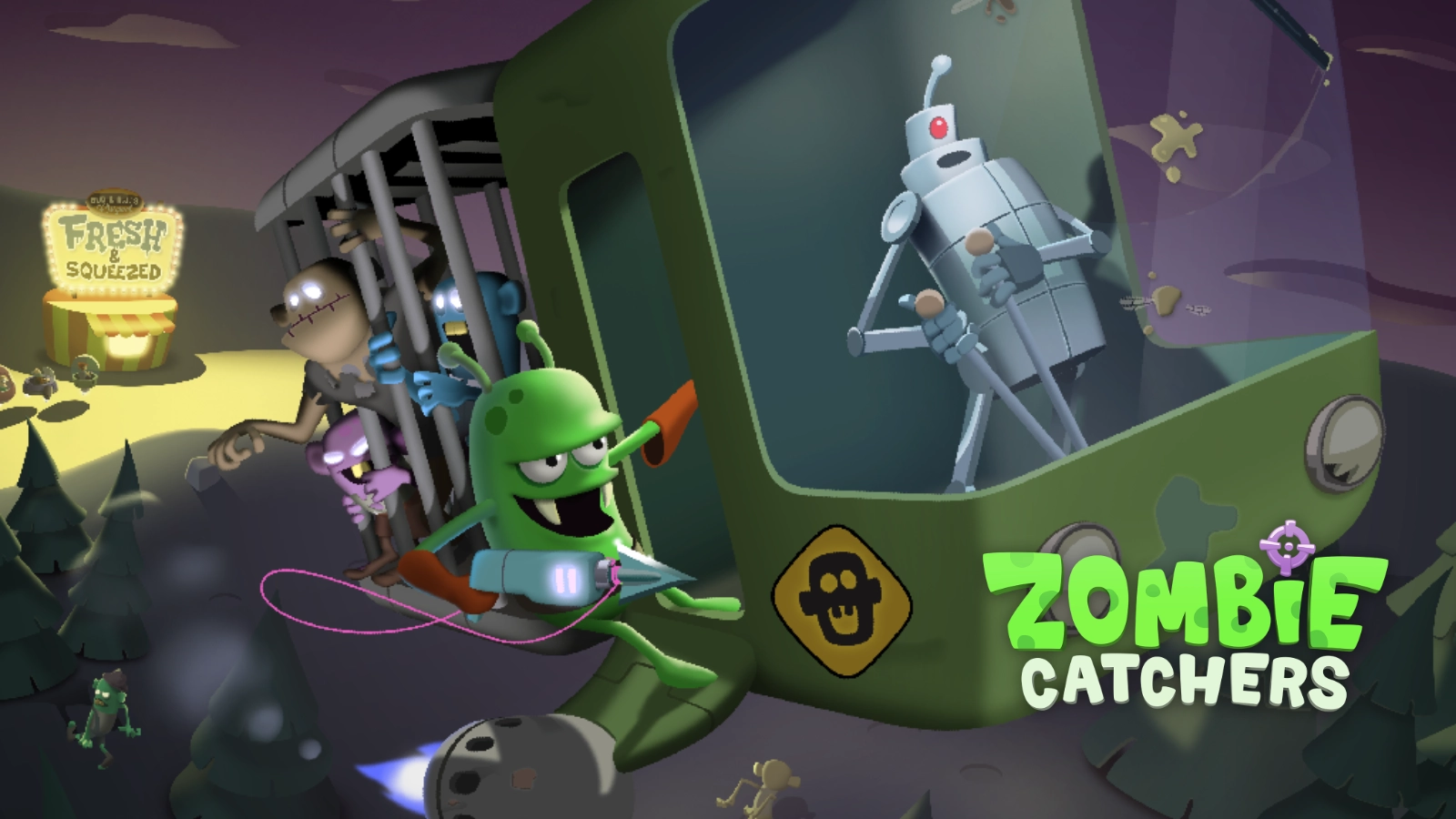僵尸榨汁机国际版(Zombie Catchers)是一款以僵尸为主题的模拟经营游戏。在游戏里,玩家将化身一名外星人,经营着一家别具一格的果汁店——这里制作果汁的原料并非各类香甜的水果,而是形形色色的小僵尸。为了让果汁店持续运营下去,你得驾驶专属飞船前往各地抓捕僵尸,再用它们榨出美味的果汁来款待顾客!