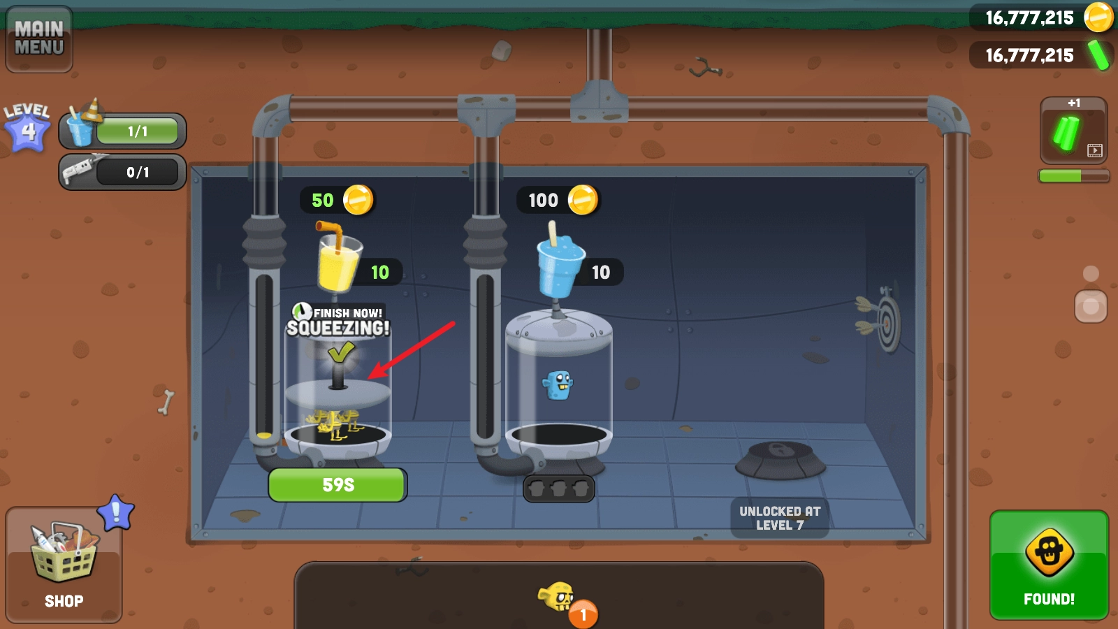 回到主界面,向下滑动就能进入榨汁机工厂,把对应的僵尸放进去就能制作果汁了。