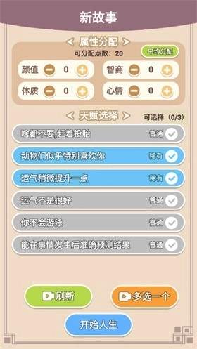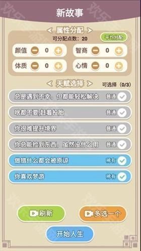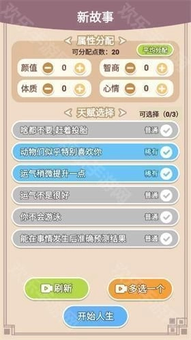 2、游戏开始时,玩家需要为你选择并添加人生天赋与属性,后续的人生轨迹发展将与这些选择紧密相关。