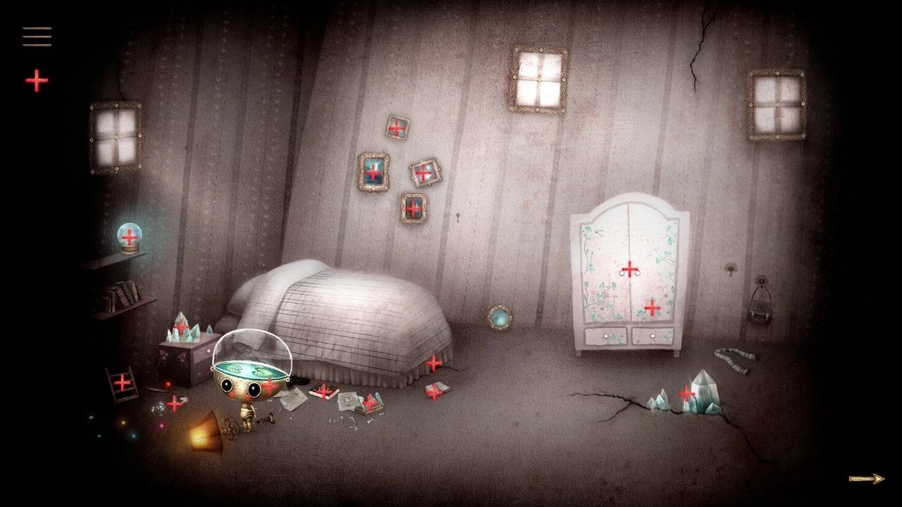 核心玩法是非常经典的点击解谜玩法,即玩家在游戏场景中通过鼠标点击的方式来寻找可互动的各种元素,比如可收集的物品、待解决的谜题和机关、可以获得信息的NPC等等。玩家通过点击的行为来解谜,一步步推进游戏关卡的进度。这种形式的解谜游戏,属于解谜游戏中最为老派传统的类型,玩家的游戏行为主要依靠观察游戏场景和不断点击试错来进行,先找出当前场景中可交互的元素,再联系剧情和场景的设定来思考如何利用它们。