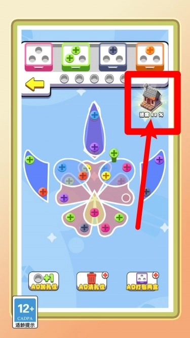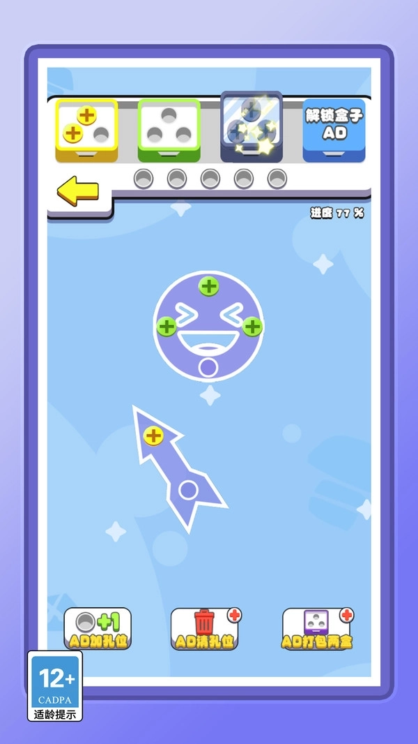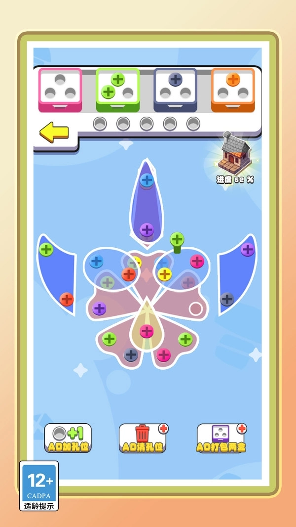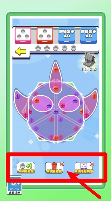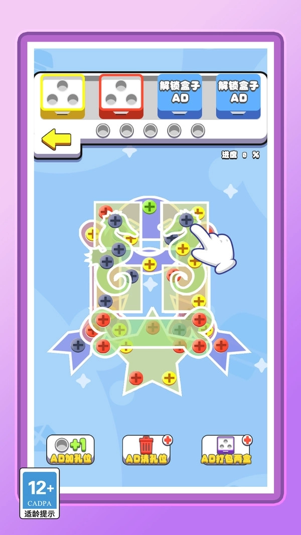 2.AD功能按钮:底部依次为加孔位、清孔位、打包两盒,观看广告可解锁对应功能,提升闯关效率与通关概率。