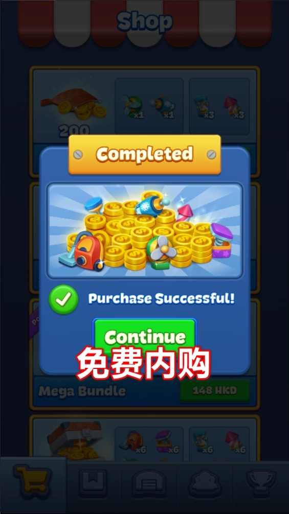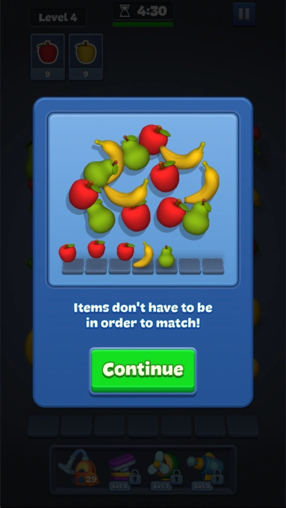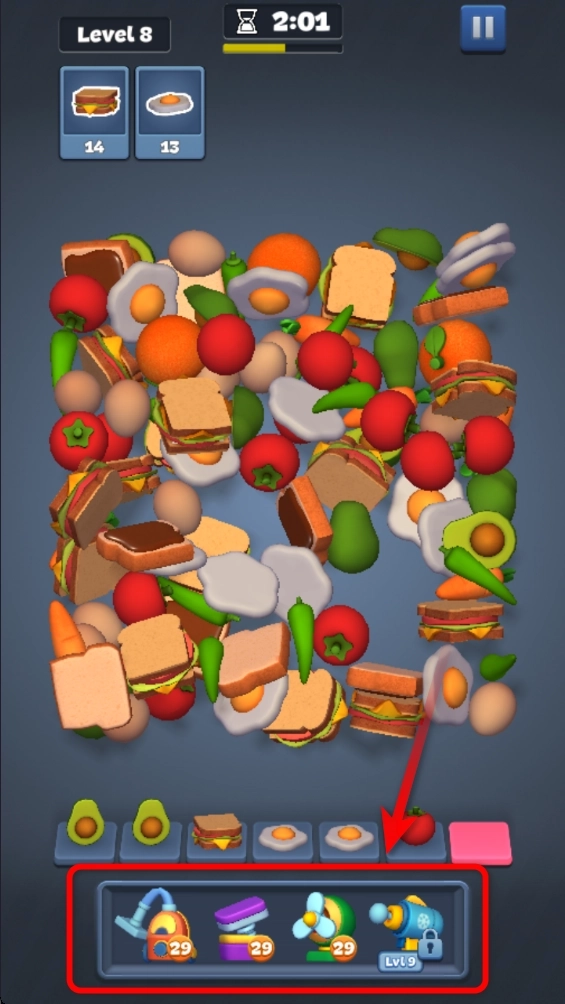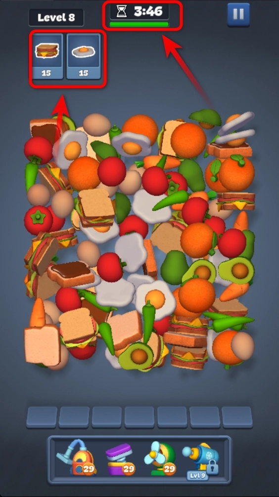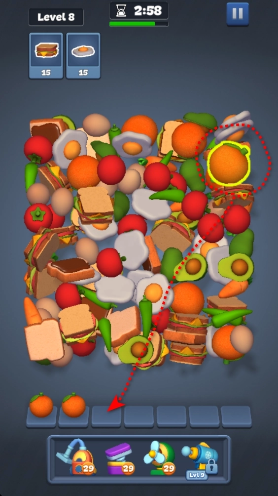 2.点击上方相同的物品,将其移动到下方,当下方出现三个相同的物品时,即可触发消除。