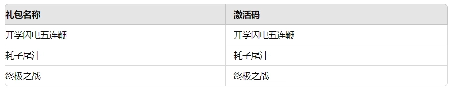 这份开学季专属礼包会在限时活动期间推出,领取方式十分便捷——玩家只需在游戏内输入对应的激活码,就能轻松获得这份福利。下面为大家附上激活码列表,赶紧来领取属于你的开学季专属好礼吧!
