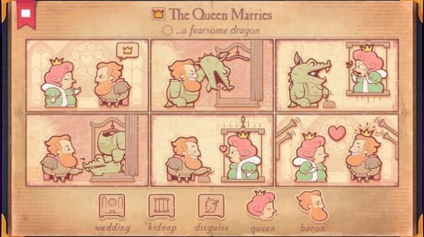 自身的美术呈现就如同一本童话故事,根据标题的描述,玩家能够自由使用下方的人物和场景素材构建一个故事,只要符合标题要求就能通关。